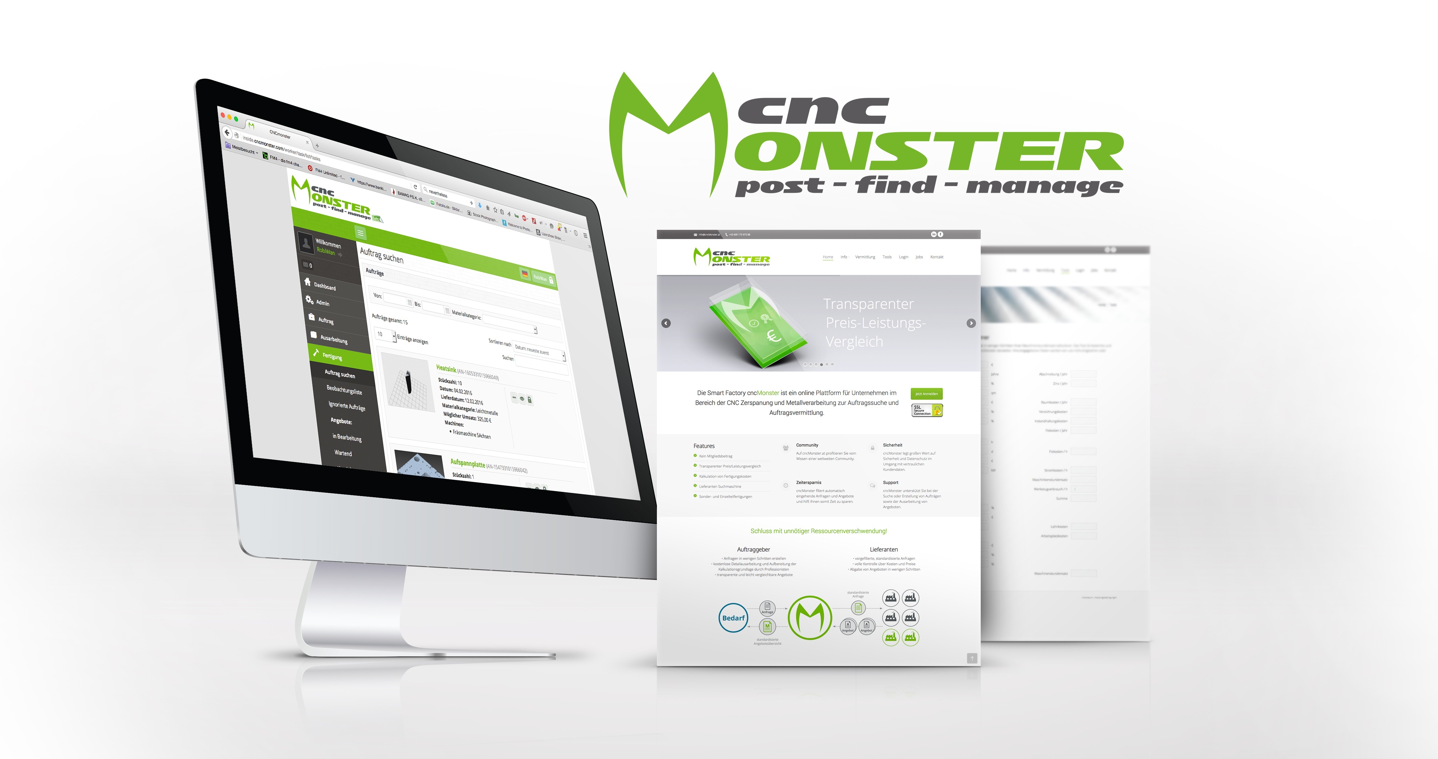 cncMonster ist eine Online-Plattform für Unternehmen in der Metallverarbeitenden Industrie, welche die Fertigungskette ohne Kostenaufwand digitalisiert. Mittels einer sogenannten Ausarbeitung, welche detaillierte Informationen zur Herstellung des Bauteils enthält, können gezielt passende Lieferanten gesucht werden. Durch die Nutzung von Endgeräten der Benutzer (Mobiltelefon, Tablet, PC), können Maschinendaten, Laufzeiten von Aufträgen, Werkzeugverbrauch und viele weitere Daten erfasst werden. Durch diese Informationen kann die Plattform gezielt Aufträge an freie Ressourcen verteilen und somit Kosten sparen.